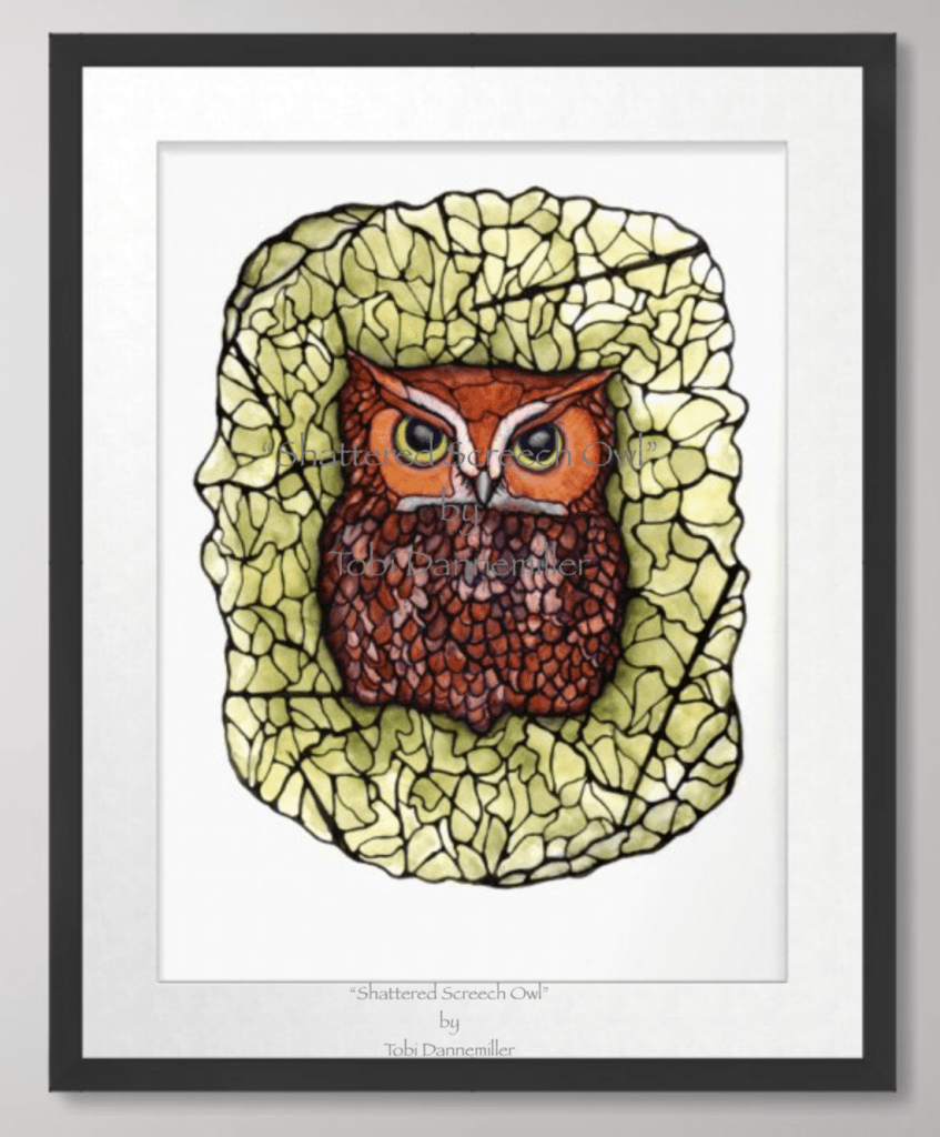 “Shattered Screech Owl” is a Gansai (Japanese Watercolor) painting featuring a Red Morph Eastern Screech Owl against a mottled forest green background resembling a stained glass window. Her eyes are bright yellow and assertive. Like this owl means business. And she does.